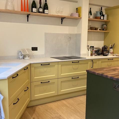 F&B Citron yellow shaker doors, Cloudy Griz Quarts worktops, Iroko Island worktop with F&B Invisible Green draw fronts, Birch ply dovetail drawers, Butler sink, and Neff appliances.